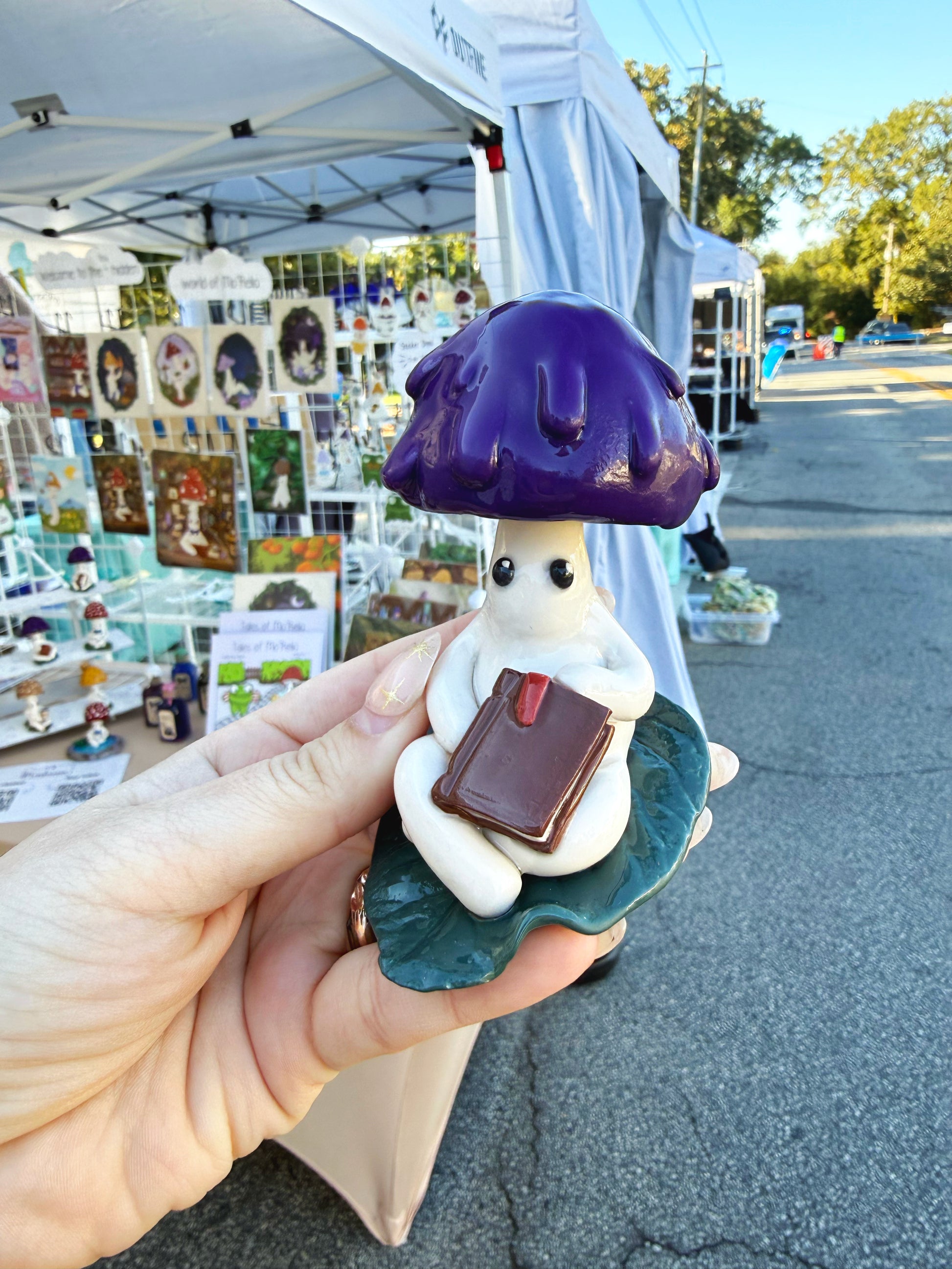 Introducing Mini Mushie - Inkheart. This quirky and playful mushie is the beloved author from Mo'Relia! Standing at 3 inches tall, this Mini Mushie is made of durable polymer clay and UV resin, sure to bring a smile to any book lover's face.