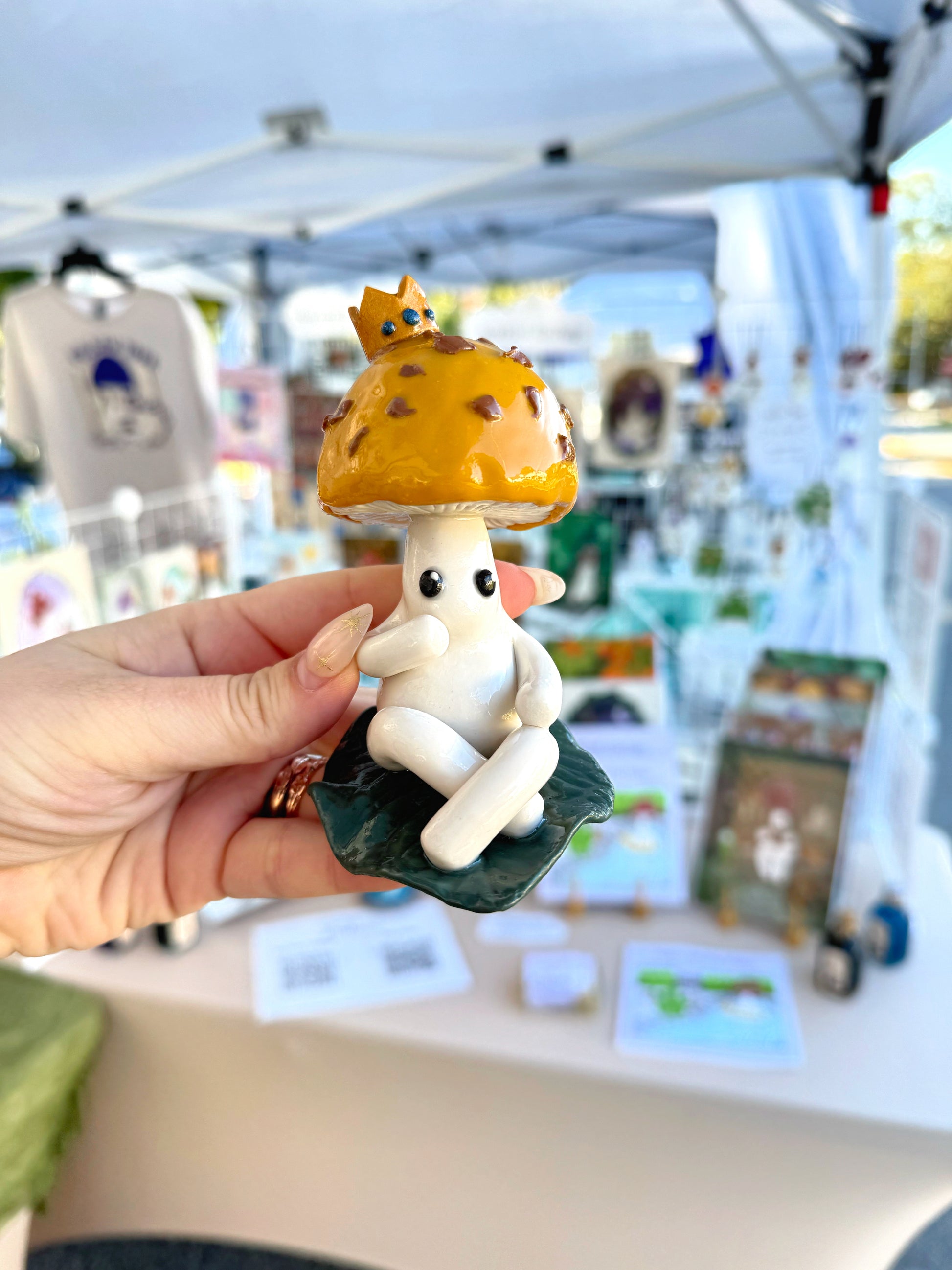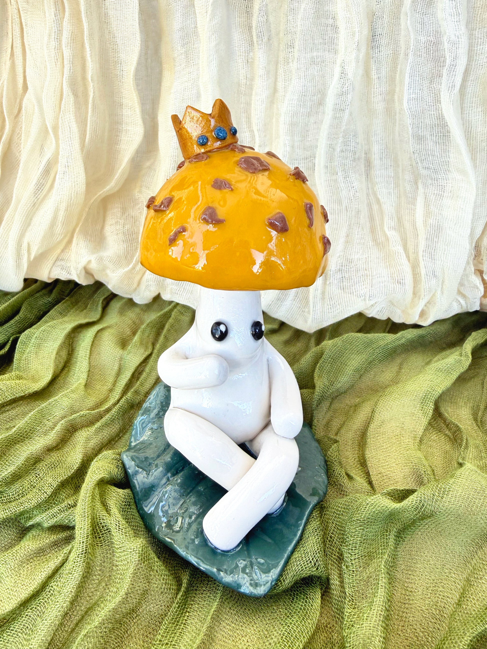 Introducing Mini Mushie - Ting Ting. This adventurous, crown topped mushie is the a treasure hunter from Mo'Relia! Standing at 3 inches tall, this Mini Mushie is made of durable polymer clay and UV resin, sure to bring a smile to any cottage core person's face.