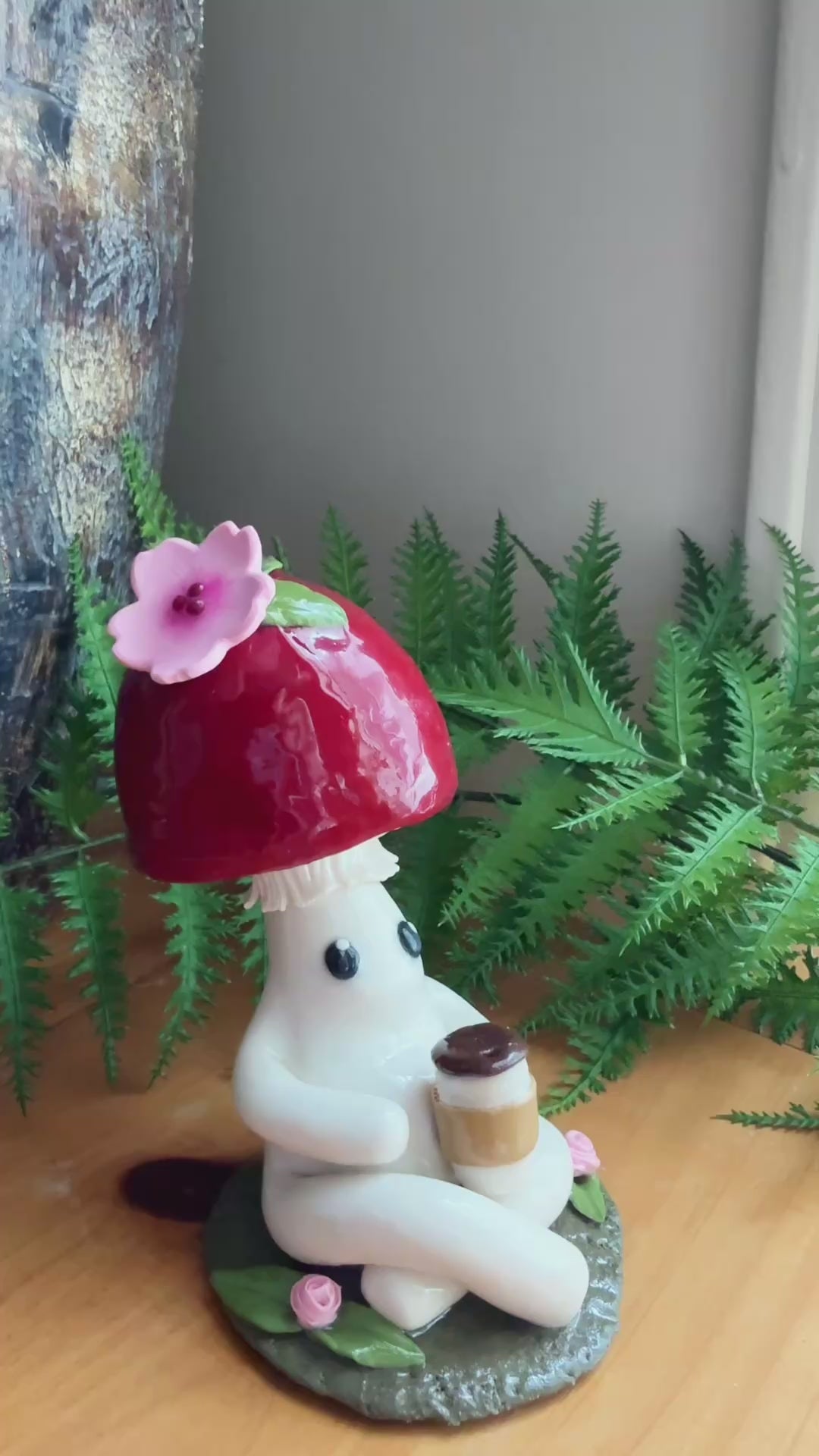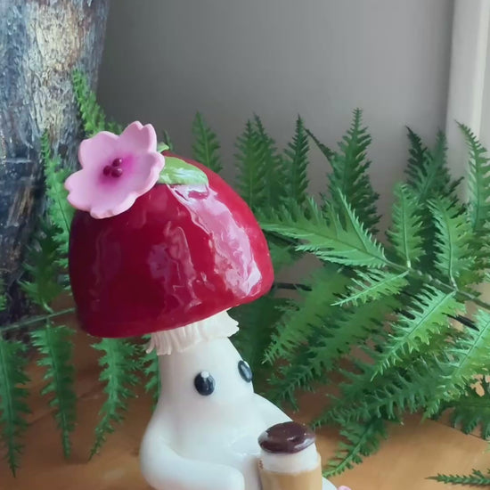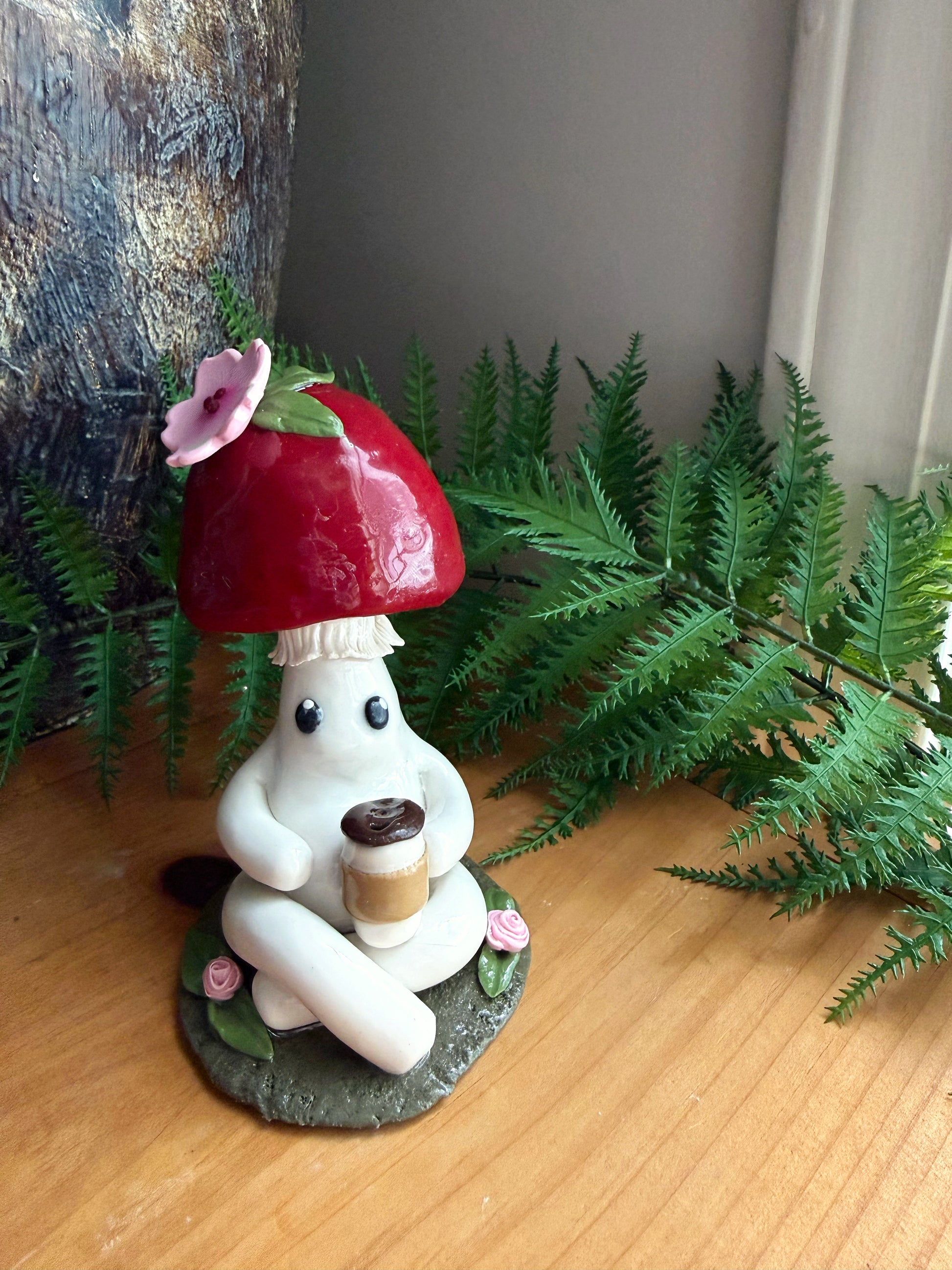 Meet Vitalus, a whimsical 4-inch polymer clay companion glazed with UV resin for lasting durability. This charming mini mushie is a coffee shop devotee, journal enthusiast, and self-proclaimed goose admirer—basically your new best friend. His signature cherry blossom spinner cap adds an interactive twist to his adorable design. Vitalus comes with an official birth certificate, making him a collectible treasure worth displaying on your desk, shelf, or anywhere that needs a dose of personality and playful magic.